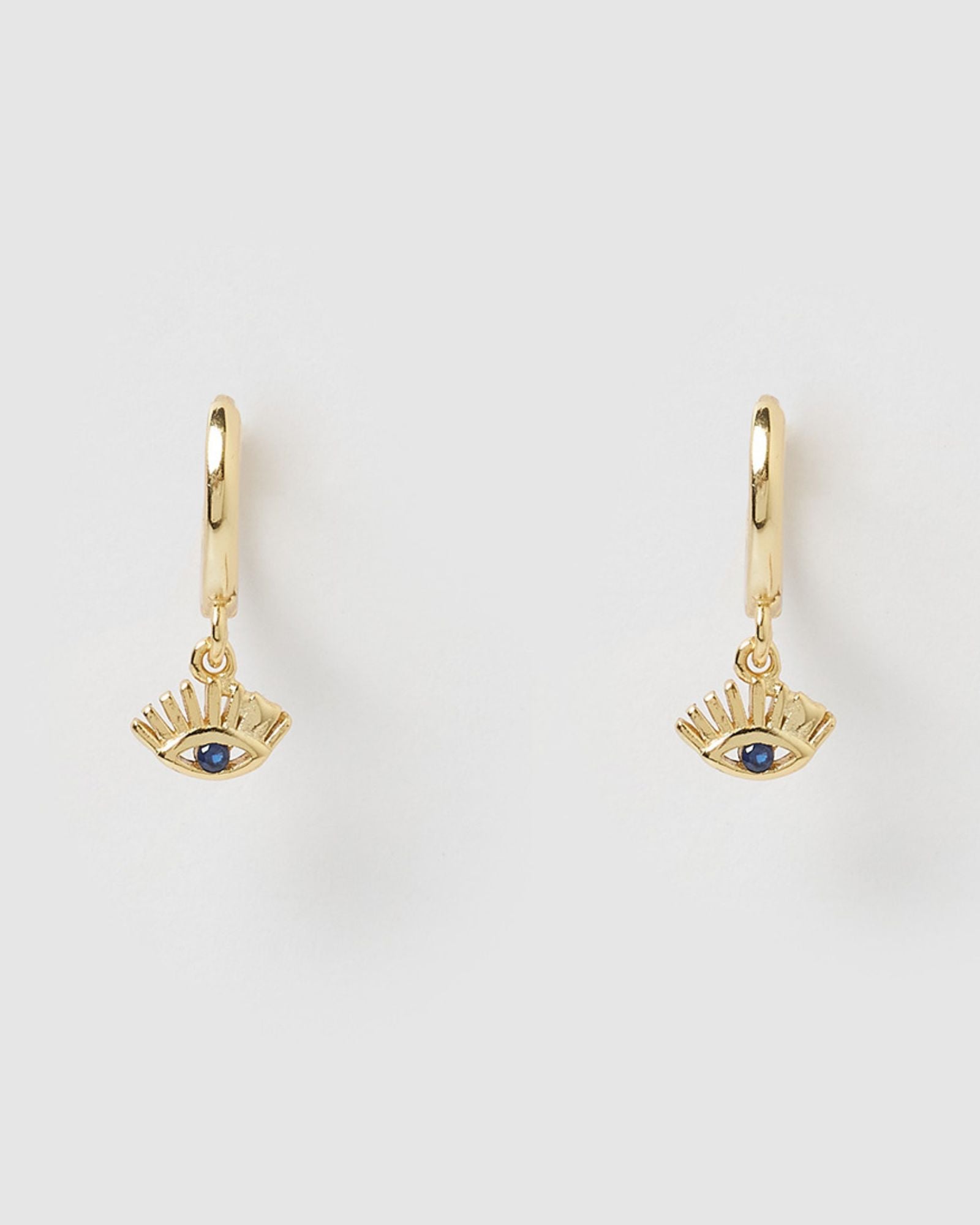 Shop petite style earrings online at Izoa. Our Ira Huggie Earrings in Gold are a petite style fit. Eye motif following on Egyptian trends and beliefs to ward off evil sprits. A great style to be worn daily.